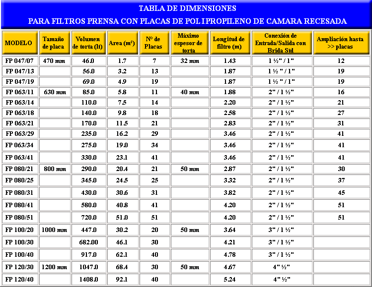 DIMENSIONES DE LOS FILTROS PRENSA FILTRONIC ®